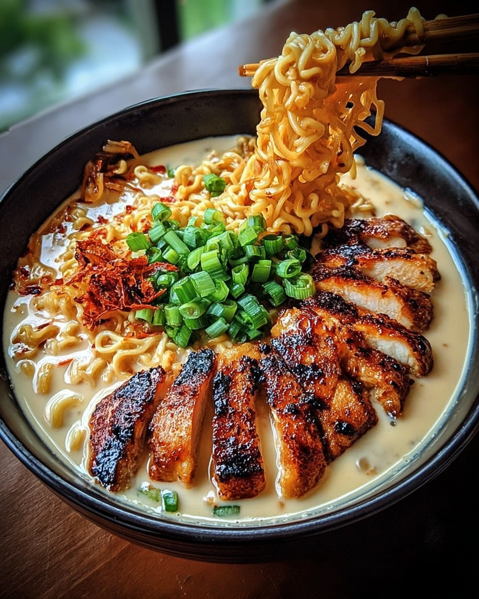 Fiery Chicken Ramen with Garlic Cream Sauce is a delightful dish that combines the warmth of ramen with a spicy kick and a rich, creamy sauce. The essential ingredients, including tender chicken thighs, fresh vegetables, and a flavorful broth, come together to create a satisfying meal. The garlic cream sauce adds a unique twist, balancing the heat from the chili paste and enhancing the overall flavor profile.